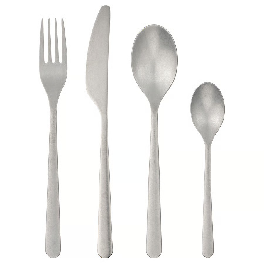 В комплект входит: вилка, нож, ложка и чайная ложка (по 4 шт. каждого вида).